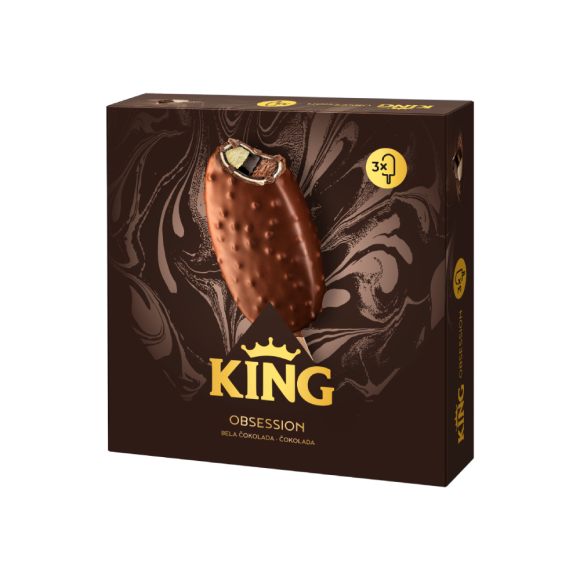 Ljubitelji raskošnih ukusa od sada svoj omiljeni King Choco Obsession mogu da podele sa svojim najbližima, i to u baš svakom trenutku! King Choco Obsession multipack donosi tri štapića u jednom pakovanju i pruža nezaboravno iskustvo i uživanje u neodoljivoj kombinaciji finog krem sladoleda sa belom i mlečnom čokoladom, obogaćenog čokoladnim punjenjem i prelivenog sa čak tri preliva – kakao, bela čokolada i tamna čokolada sa hrskavim posipom.