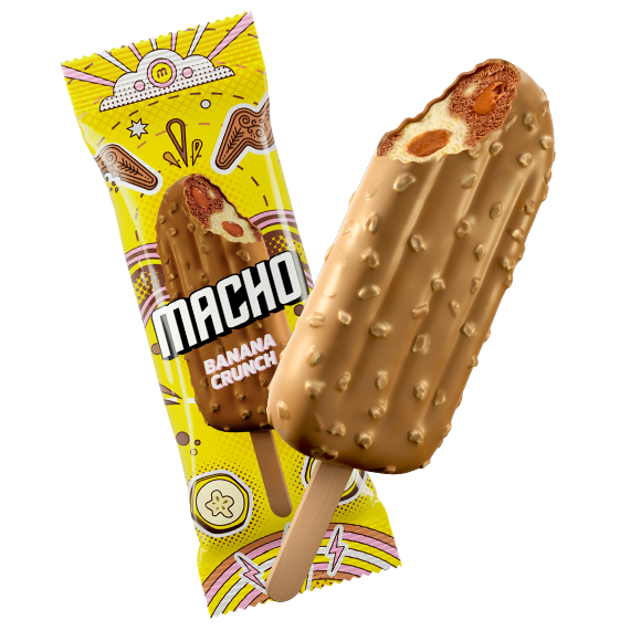 Upoznaj novi sladoled koji je „Tvrd spolja, mekan iznutra" - Macho Banana Crunch - prvi Macho s dvostrukom kombinacijom ukusa koja pomera granice! Kremasti sladoled ukusa banane i bogati ukus biskvita od kakaa savršeno se stapaju dok se u sredini skriva slasni preliv ukusa cimeta. Svaki zalogaj prava je eksplozija kombinacije punih ukusa, a hrskavi sloj ukusa lešnika s komadićima vafla donosi crunch zbog kojeg ćeš se vraćati po još. Uz ovaj neodoljivi sladoled uveri se da prava snaga dolazi iznutra, iz autentičnosti i spremnosti da budeš ono što jesi. Ne propusti priliku da probaš novi Macho Banana Crunch. Otkrij i druge Macho ukuse.