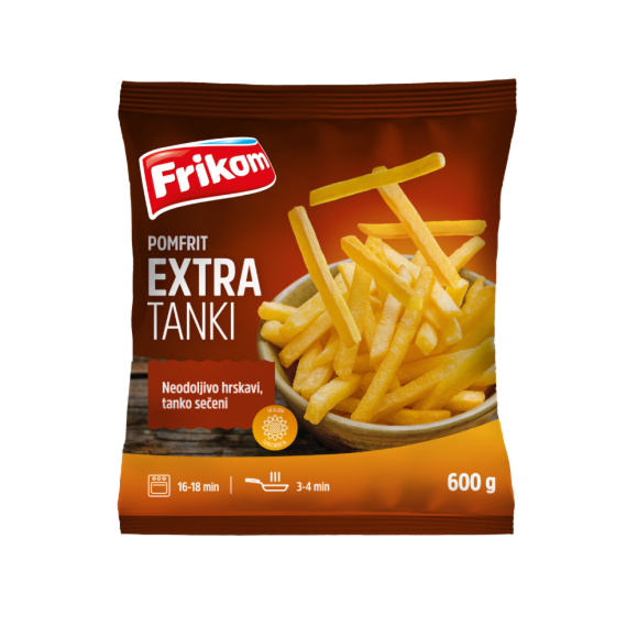Frikom ekstra tanki pomfrit je novi oblik delimično prženih, hrskavih i tanko sečenih štapića krompira. Odlikuje ga brza i jednostavna priprema. Napravljen je od biranih sorti vrlo kvalitetnog krompira i jednostavan je za pripremu.