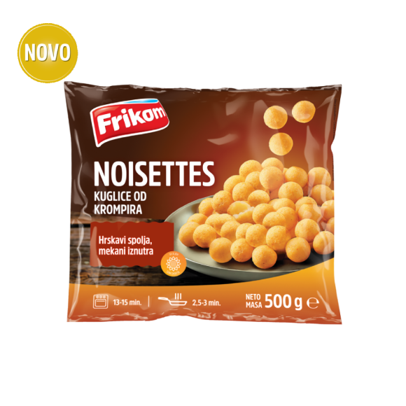 Frikom Noisettes kuglice od krompira predstavljaju savršeni kontrast hrskave spoljašnosti i mekane unutrašnjosti. Odlikuje ga brza i jednostavna priprema. Napravljen je od biranih sorti vrlo kvalitetnog krompira i jednostavan je za pripremu. Odlično će se uklopiti kao prilog uz ribu ili meso, ali može se poslužiti i uz različite umake.