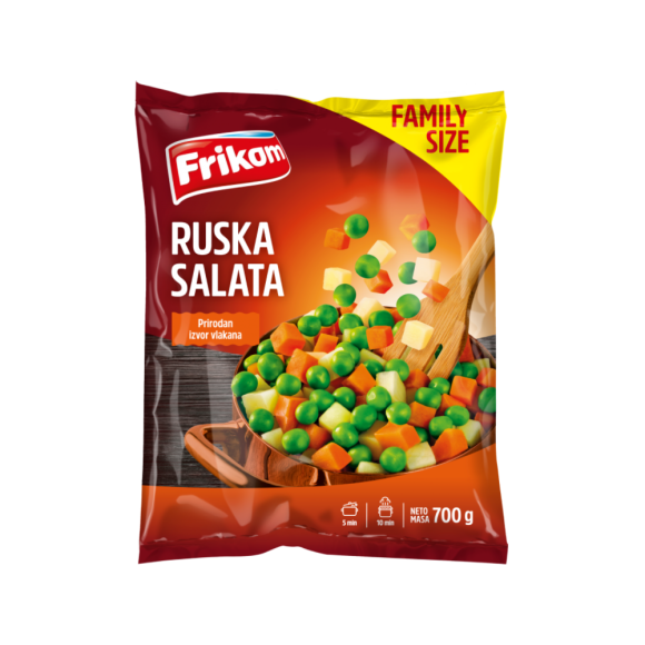 Frikom Mešano povrće za rusku salatu sastoji se od šargarepe i krompira u kockicama i graška. Ova mešavina savršena je za pripremu različitih osvežavajućih jela.