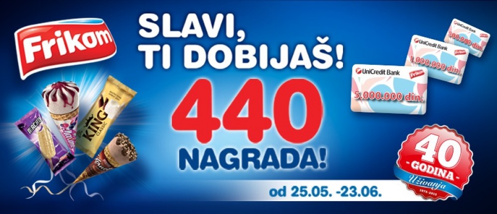 Ukoliko u periodu od 25. maja do 23. juna pronađete 2 ista znaka na štapiću Frikomovog sladoleda, dobitnik ste jedne od vrednih nagrada.