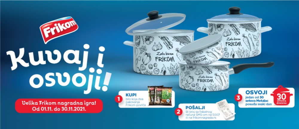 Mehanizam nagradne igre je jednostavan, a nagrade vrlo atraktivne. Uz kupljena bilo koja dva pakovanja Frikom smrznutog povrća, učesnici dobijaju priliku da osvoje svakog dana jedan od 30 setova Metalac posuđa! Sve što je potrebno je da pošaljete BI BROJ sa računa SMS-om na broj 5007 ili na www.frikomnagrade.rs