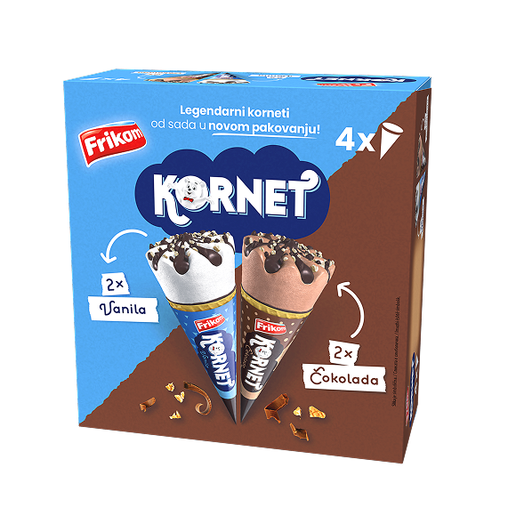 Najpoznatiji ukusi legendarnih korneta sada dolaze u praktičnom multipack pakovanju od četiri komada. Ovo praktično pakovanje sadrži najpopularnije Kornete – vanilu i čokoladu. Idealno je za deljenje i uživanje sa najbližima u svakom trenutku. Požurite po svoj multipack i uživajte u omiljenim ukusima kad god i sa kim god poželite!