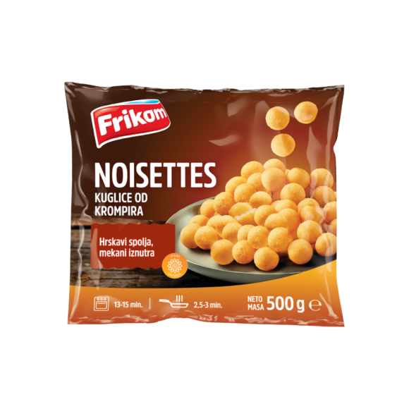 Frikom Noisettes kuglice od krompira predstavljaju savršeni kontrast hrskave spoljašnosti i mekane unutrašnjosti. Odlikuje ga brza i jednostavna priprema. Napravljen je od biranih sorti vrlo kvalitetnog krompira i jednostavan je za pripremu. Odlično će se uklopiti kao prilog uz ribu ili meso, ali može se poslužiti i uz različite umake.