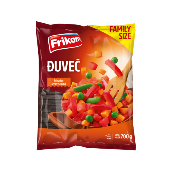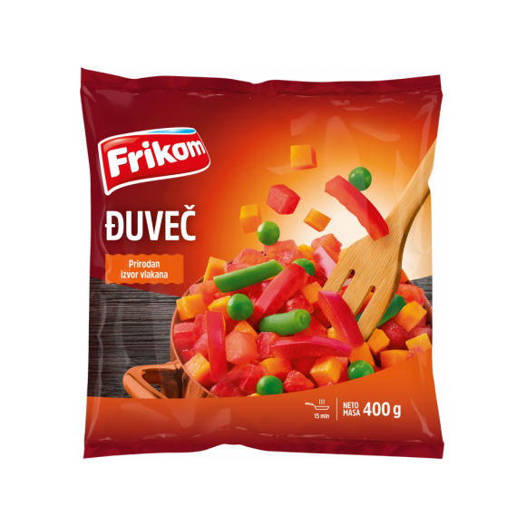 Frikom Mešano povrće za đuveč se sastoji od rezane crvene paprika, graška, zelene boranije kao i šargarepe i paradajza u kockicama. Ova mešavina dobra je za pripremu sočnog priloga sa dodatkom pirinča i uz mesna jela, a može koristiti za kuvanje različitih testenina ili lazanja sa povrćem. Mešano povrće za đuveč olakšaće kuvaricama posao i osloboditi ih dosadnog seckanja za pripremu jela bogatog povrćem.